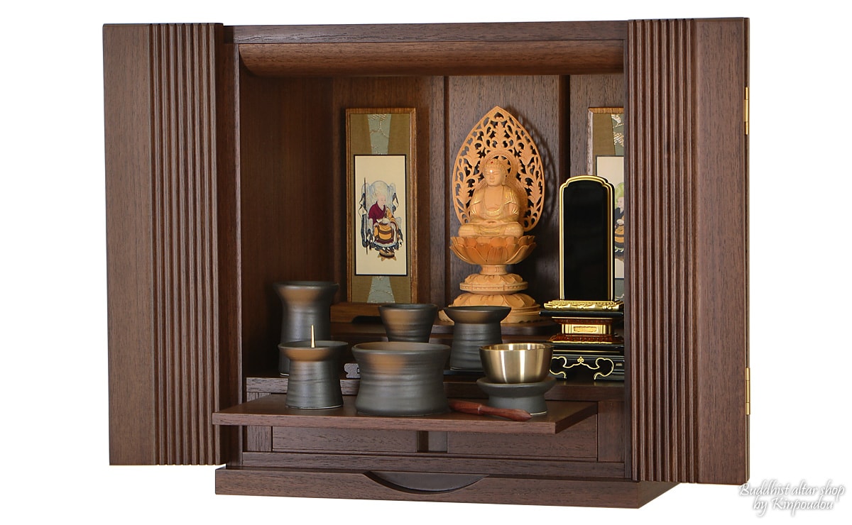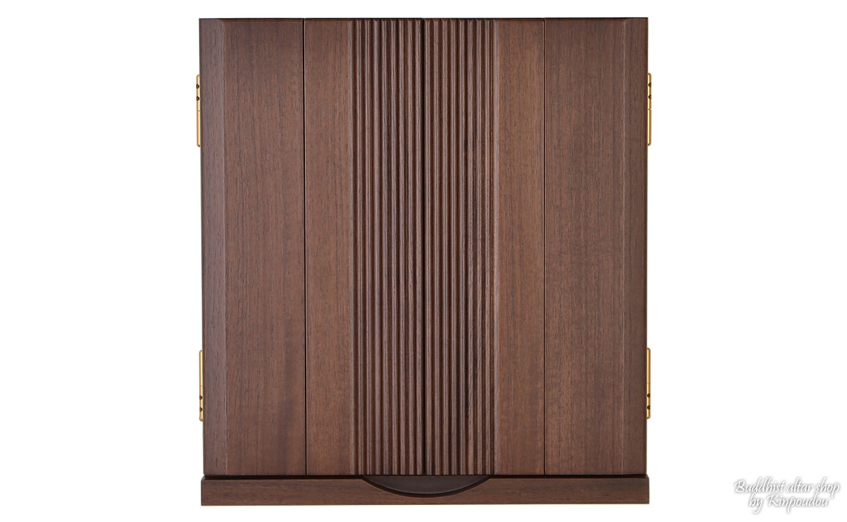 扉を縦に流れる幾つものラインが特徴的なモダンミニ仏壇『ポルカ ウォールナット』。 とてもコンパクトでスマートなそのサイズは、インテリア性抜群で、和室・洋室問わず設置することができます。素材にはウォールナットを使用し、落ち着いた色合いに仕上げられています。内陣は、本尊台と須弥壇を取り外す事ができ、自由にレイアウトでき、お掃除もしやすいお仏壇です。また、扉から須弥壇等の細部に至るまで拘りぬき職人の技が魅せる、上質な国産のモダンミニ仏壇となっております。 近年の住宅事情も考慮し、扱いやすいスマートなサイズで、和・洋室どちらにも馴染む家具のようなインテリア性も兼ねている、当店イチオシのお仏壇です。