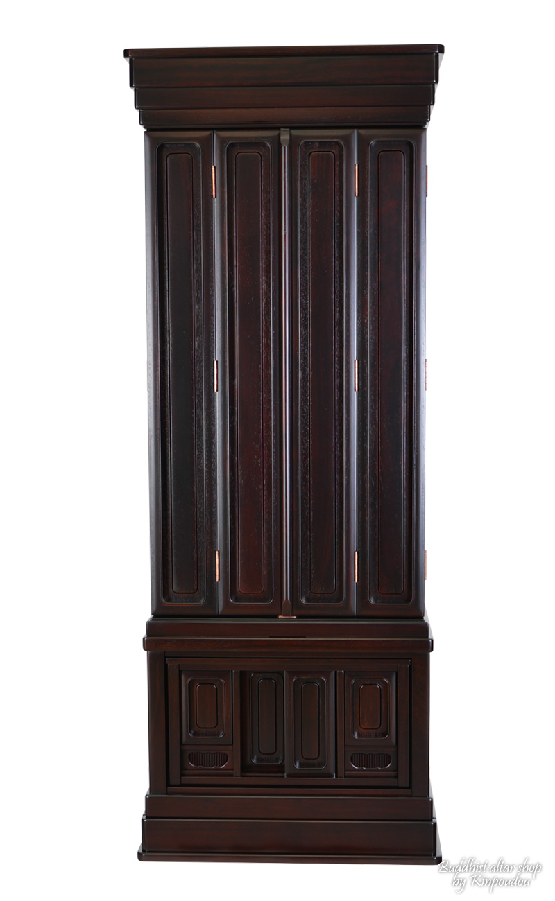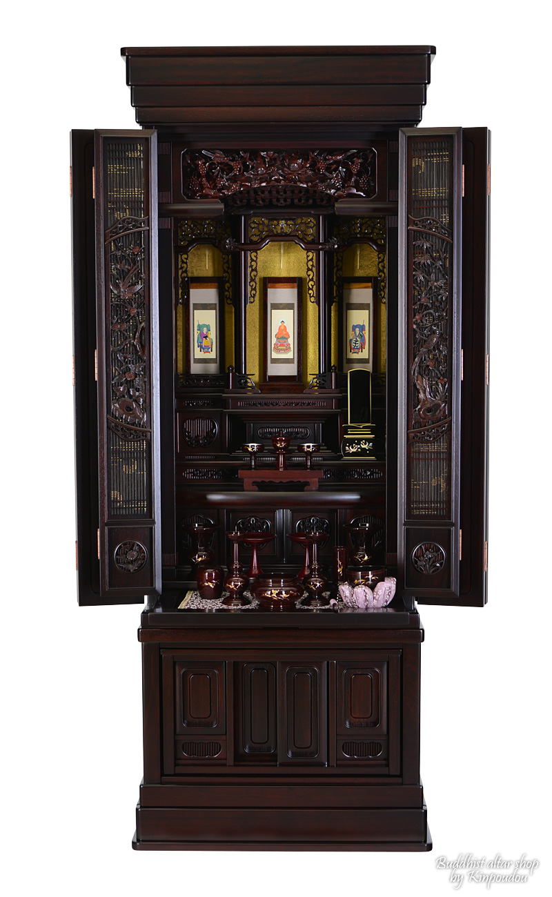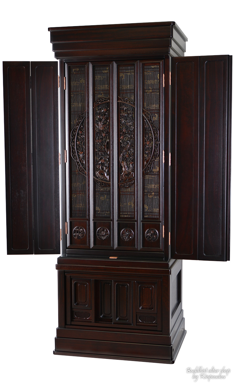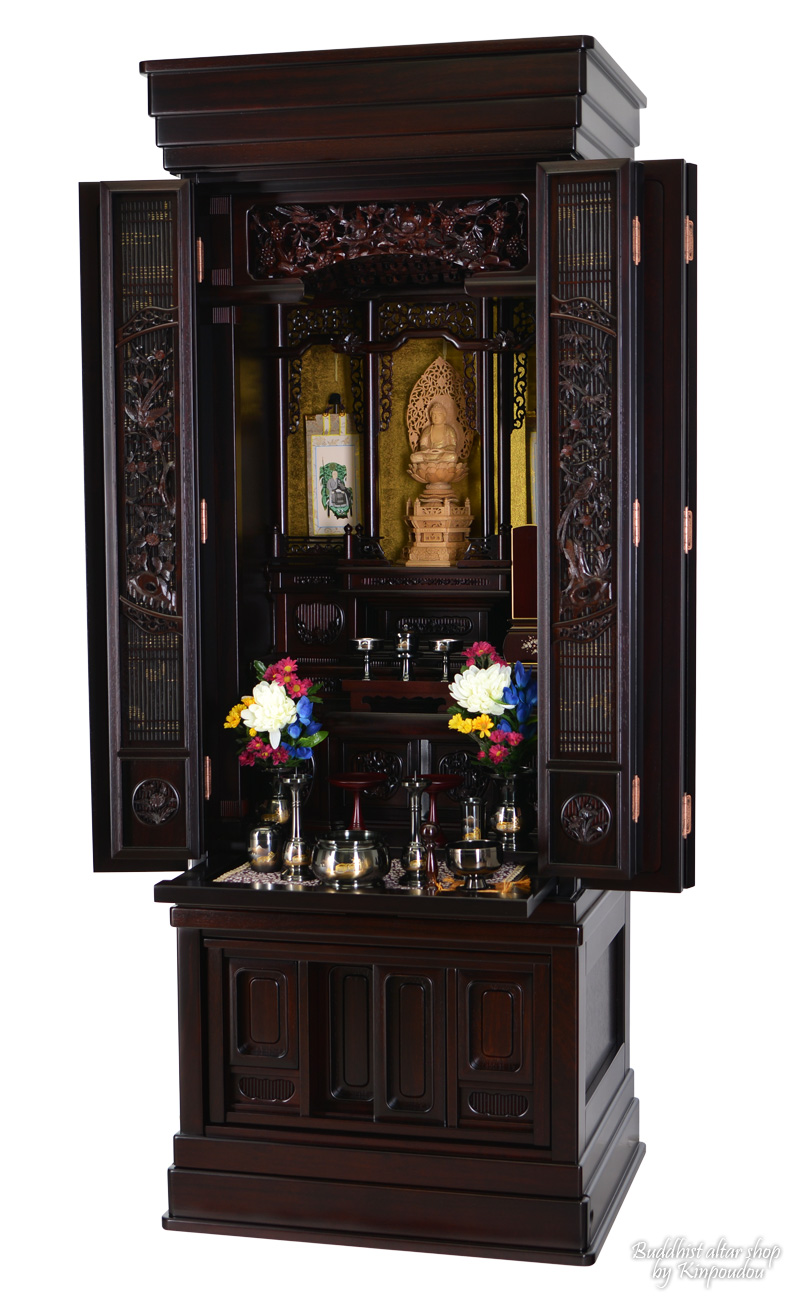 奥深く上品な色合いと美しい木目が特徴的な高級唐木紫檀系を採用した『伊吹 紫檀系』。欄間や障子には様々な樹木や花々が咲き誇った様子を表した優雅な彫刻が施された情緒溢れる一品に仕上がっています。また、機能性に優れ、お仏壇下台にはスライド式の経机を設けておりますので、正座をしてちょうど良い位置で毎日のお祀りが行えるように設計されています。利便性を追求し伝統的な様式美を崩さないフォルムで和室はもちろん、洋室にも馴染みやすいデザインに仕上がっています。