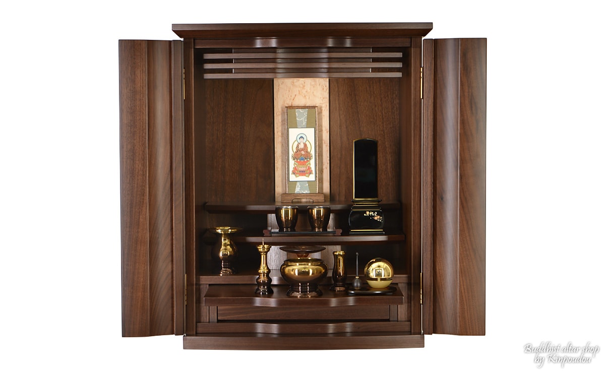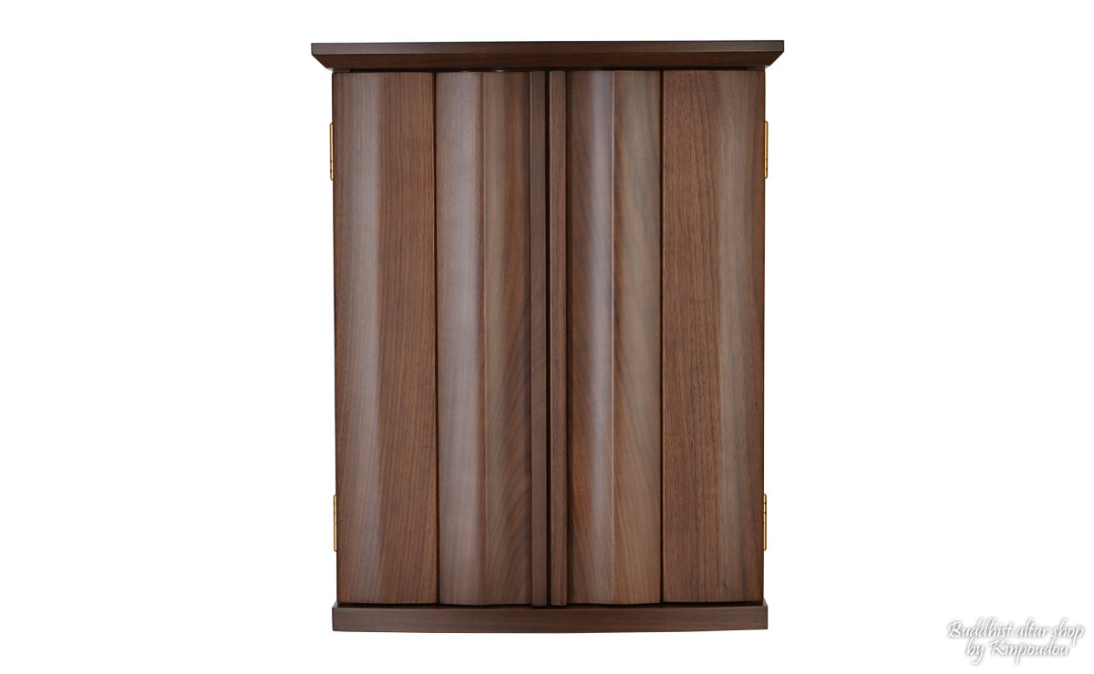 銘木ウォールナットを素材とし、木の質感を存分に活かした落ち着いた色合いのモダンミニ仏壇『由布院 18号』。扉部分に独特の曲線を持ち、優雅で躍動感を感じる佇まいとなっております。更に扉には無垢材を使用しており、 美しい木目模様は、力強く、気品溢れる雰囲気を醸し出し、お部屋を優雅に演出します。和室はもちろんのこと、洋室に設置しても違和感なく調和し、現代のライフスタイルに寄り添うお仏壇となっております。 機能面では、スライド式仏具板と収納に便利な引き出しを完備しております。収納スペースを上手に利用していただくことで、毎日のお祀りをスムーズに行えるだけでなく、お仏壇周りも綺麗に保つことができます。
