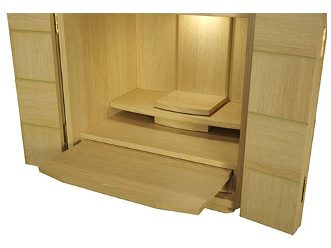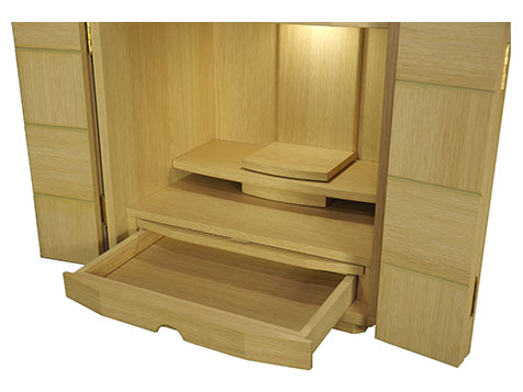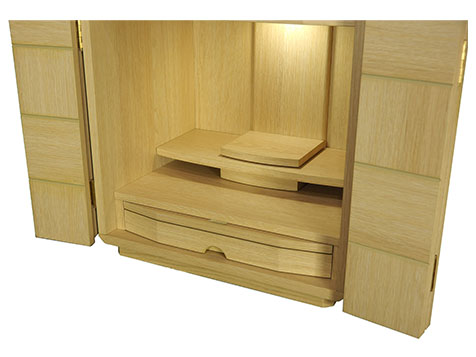 置き場所を選ばないコンパクトサイズで、扉を閉めると正方形の重なったデザインがかわいらしいお仏壇です。お線香などを入れておくのに便利な収納や、お供えなどもしやすいようにスライド式の棚も備わっており使いやすさも魅力です。